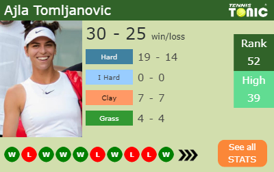Tomljanovic has a 30-25 win-loss record in 2019, 19-14 on hard (See FULL STATS).