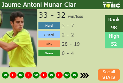 Antoni Munar Clar has a 33-32 win-loss record in 2019, 28-19 on clay (See FULL STATS).
