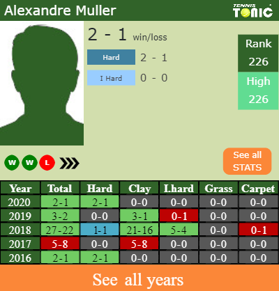 Alexandre has a 2-1 win-loss record in 2020, 2-1 on hard (See FULL STATS).