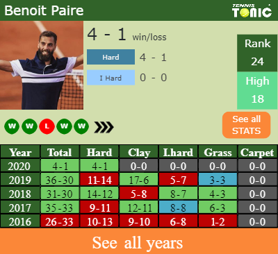 Paire has a good win-loss record in the last 10 years having won 51% of his matches (541-517). 4-1 on hard in 2020 Talking about his performance on the same surface of this competition, Paire has a 327-270 win-loss record in the last 10 years on hard.