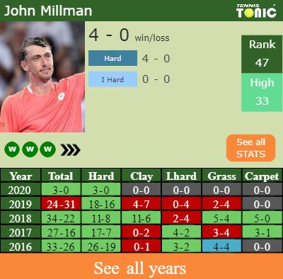 Millman has a solid win-loss record in the last 10 years having won 61% of his matches (802-518). 3-0 on hard in 2020 Regarding his performance on the same surface of this competition, Millman has a 232-169 win-loss record in the last 10 years on hard.