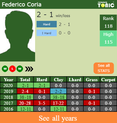 Coria has a 2-1 win-loss record in 2020, 2-1 on hard (See FULL STATS).