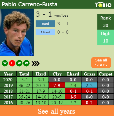 Carreno-Busta has a solid record in the last 10 years having won 63% of his matches (581-344). 3-1 on hard in 2020. Regarding his performance on the same surface of this competition, Carreno-Busta has a 302-198 win-loss record in the last 10 years on hard.