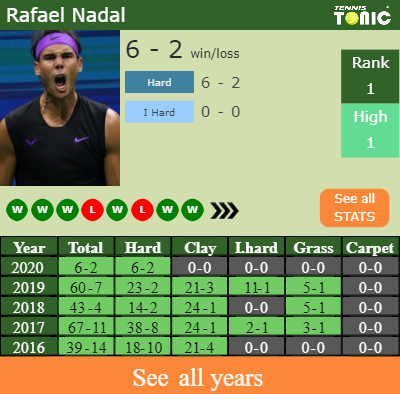 Nadal has a a remarkable record in the last 10 years having won 81% of his matches (1076-256). 6-2 on hard in 2020. Regarding his performance on the same surface of this tournament, Nadal has a 502-97 win-loss record in the last 10 years on hard.