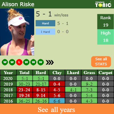 Riske has a winning record in the last 10 years having won 51% of her matches (695-655). 5-1 on hard in 2020. Regarding her performance on the same surface of this event, Riske has a 195-184 win-loss record in the last 10 years on hard.