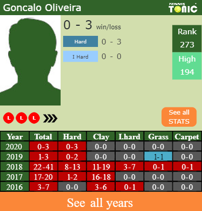 Oliveira has a 0-3 win-loss record in 2020, 0-3 on hard (See FULL STATS).