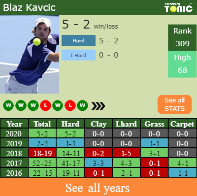 Kavcic has a solid record in the last 10 years having won 67% of his matches (874-428). 5-2 on hard in 2020. In connection with his performance on the same surface of this competition, Kavcic has a 280-186 win-loss record in the last 10 years on hard.
