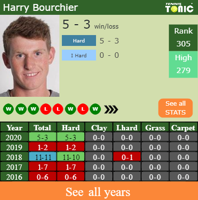 Bourchier has a 5-3 win-loss record in 2020, 5-3 on hard (See FULL STATS).
