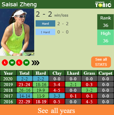 Zheng has a 2-2 win-loss record in 2020, 2-2 on hard (See FULL STATS).