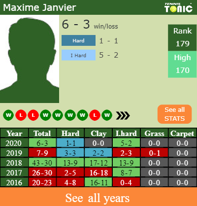 Janvier has a unfavourable win-loss record in the last 7 years having won 46% of his matches (178-153). 5-2 on indoor hard courts in 2020. Talking about his performance on the same surface of this competition, Janvier has a 106-107 record in the last 7 years on indoor hard courts.