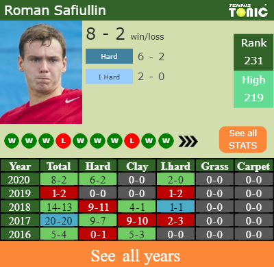 Safiullin has a 8-2 win-loss record in 2020, 2-0 on indoor hard courts (See FULL STATS).