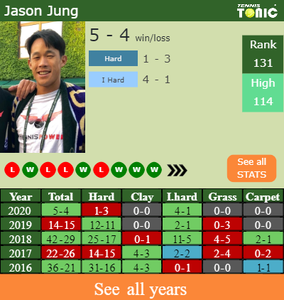 Jung has a solid win-loss record in the last 9 years having won 63% of his matches (162-95). 4-1 on indoor hard courts in 2020. Talking about his performance on the same surface of this competition, Jung has a 176-154 win-loss record in the last 9 years on indoor hard courts.