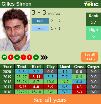 Simon has a winning win-loss record in the last 10 years having won 58% of his matches (387-275). 1-1 on indoor hard courts in 2020. In connection with his performance on the same surface of this event, Simon has a 300-225 win-loss record in the last 10 years on indoor hard courts.
