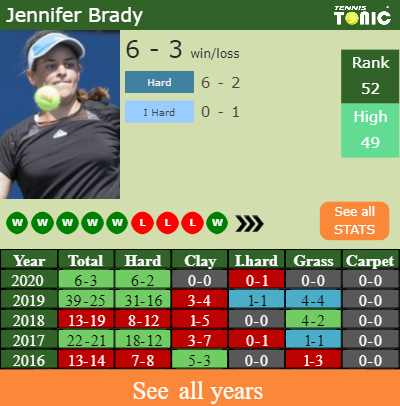 Brady has a losing record in the last 7 years having won 41% of her matches (513-358). 6-2 on hard in 2020. Regarding her performance on the same surface of this tournament, Brady has a 97-89 record in the last 7 years on hard.