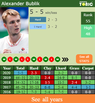 Bublik has a solid record in the last 7 years having won 62% of his matches (209-129). 3-2 on indoor hard courts in 2020. Regarding his performance on the same surface of this competition, Bublik has a 157-115 win-loss record in the last 7 years on indoor hard courts.