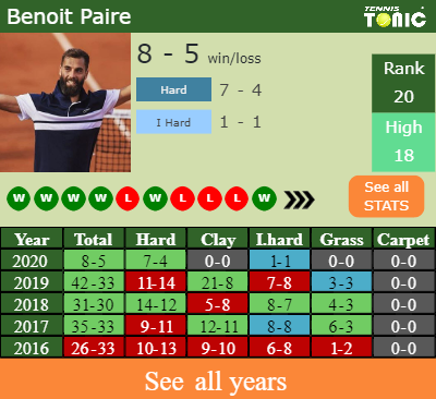 Paire has a positive win-loss record in the last 10 years having won 57% of his matches (414-318). 1-1 on indoor hard courts in 2020. Talking about his performance on the same surface of this tournament, Paire has a 337-277 win-loss record in the last 10 years on indoor hard courts.