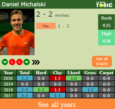Michalski has a fantastic win-loss record in the last 4 years having won 100% of his matches (4-0). 1-0 on indoor hard courts in 2020. In connection with his performance on the same surface of this competition, Michalski has a 10-10 win-loss record in the last 4 years on indoor hard courts.