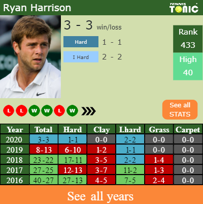 Harrison has a winning record in the last 10 years having won 55% of his matches (702-572). 1-1 on hard in 2020. In connection with his performance on the same surface of this competition, Harrison has a 252-224 record in the last 10 years on hard.