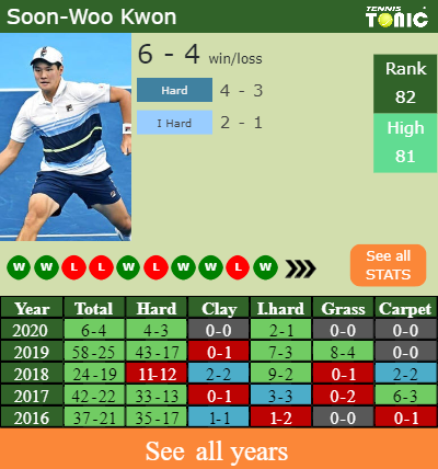 Kwon has a losing record in the last 7 years having won 34% of his matches (583-295). 4-3 on hard in 2020. Talking about his performance on the same surface of this tournament, Kwon has a 170-96 record in the last 7 years on hard.