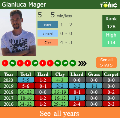 Mager has a losing win-loss record in the last 7 years having won 43% of his matches (477-355). 4-3 on clay in 2020. Regarding his performance on the same surface of this competition, Mager has a 107-104 win-loss record in the last 7 years on clay.
