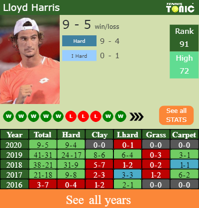 Lloyd has a solid record in the last 6 years having won 65% of his matches (327-179). 9-4 on hard in 2020. Regarding his performance on the same surface of this competition, Lloyd has a 114-84 win-loss record in the last 6 years on hard.