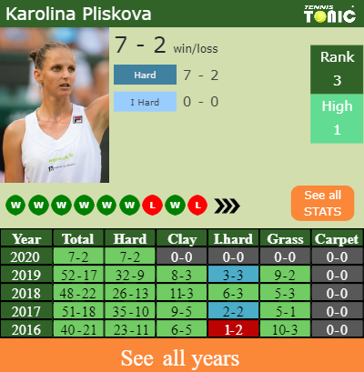 The Czech has a 7-2 win-loss record in 2020, 7-2 on hard (See FULL STATS).