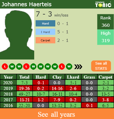 Haerteis has a winning record in the last 8 years having won 58% of his matches (146-107). 5-1 on indoor hard courts in 2020. Talking about his performance on the same surface of this tournament, Haerteis has a 113-107 record in the last 8 years on indoor hard courts.