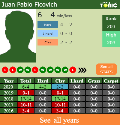 Talking about his overall career, Pablo Ficovich has an overall 43-43 record. He has flat 0-0 record on indoor hard courts.