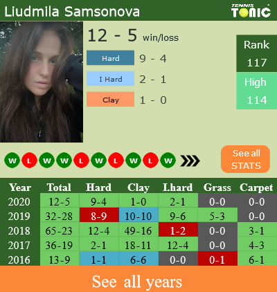 Samsonova has a negative record in the last 5 years having won 33% of her matches (234-116). 1-0 on clay in 2020. Regarding her performance on the same surface of this tournament, Samsonova has a 158-84 win-loss record in the last 5 years on clay.