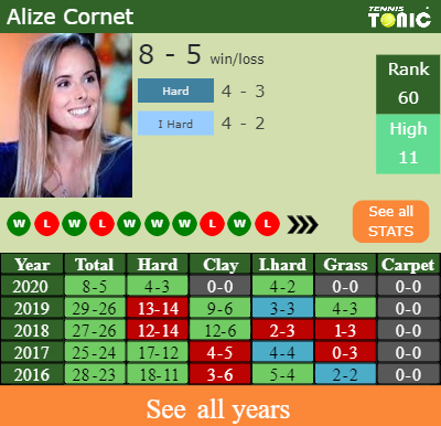Alize has a 8-5 win-loss record in 2020, 4-3 on hard (See FULL STATS).