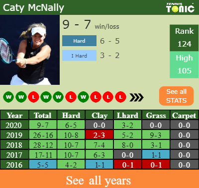Caty has a 9-7 win-loss record in 2020, 6-5 on hard (See FULL STATS).