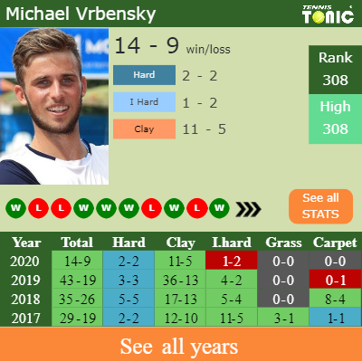 Vrbensky has a solid win-loss record in the last 4 years having won 68% of his matches (198-95). 11-5 on clay in 2020. Regarding his performance on the same surface of this event, Vrbensky has a 121-73 record in the last 4 years on clay.