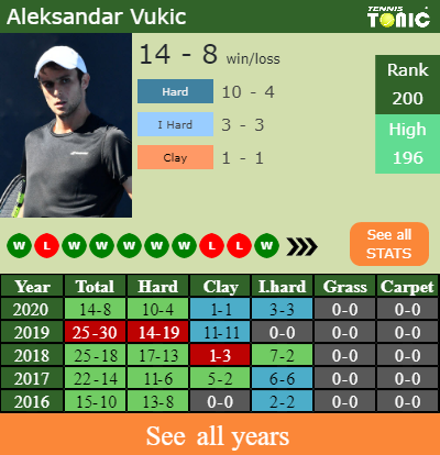 Vukic has a 14-8 win-loss record in 2020, 1-1 on clay (See FULL STATS).