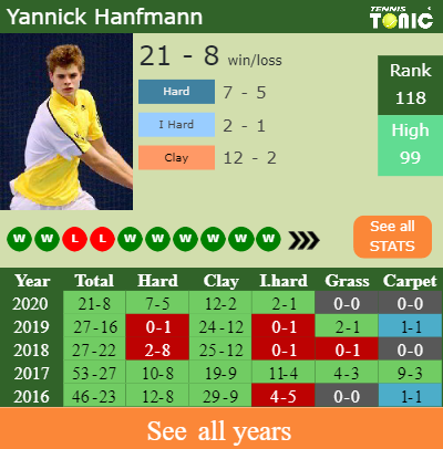 The German has a 21-8 win-loss record in 2020, 12-2 on clay (See FULL STATS).