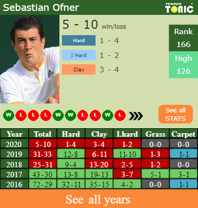 Sebastian has a 5-10 win-loss record in 2020, 3-4 on clay (See FULL STATS).