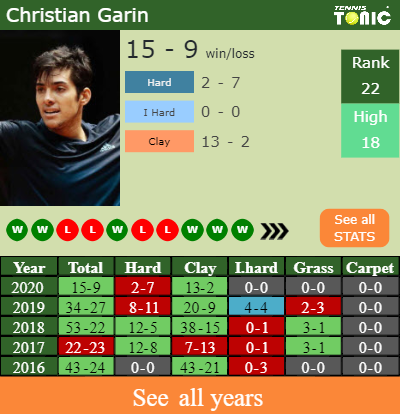 The Chilean has a 15-9 win-loss record in 2020, 13-2 on clay (See FULL STATS).