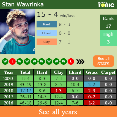 Stan has a 15-4 win-loss record in 2020, 7-1 on clay (See FULL STATS).
