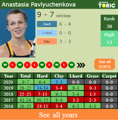 Anastasia has a 9-7 win-loss record in 2020, 3-3 on clay (See FULL STATS).