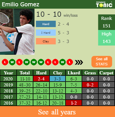 Gomez has a solid win-loss record in the last 10 years having won 60% of his matches (288-192). 6-3 on indoor hard courts in 2020. Talking about his performance on the same surface of this tournament, Gomez has a 18-14 win-loss record in the last years on indoor hard courts.