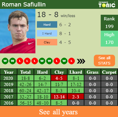 Safiullin has a 18-8 win-loss record in 2020, 8-1 on indoor hard courts (See FULL STATS).