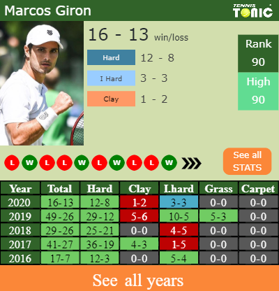 Giron has a solid win-loss record in the last 9 years having won 61% of his matches (256-164). 3-3 on indoor hard courts in 2020. Regarding his performance on the same surface of this tournament, Giron has a 31-27 match record in the last 9 years on indoor hard courts.