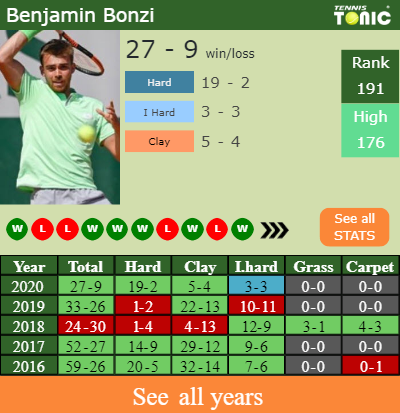 Bonzi has a solid match record in the last 5 years having won 62% of his matches (195-118). 19-2 on hard in 2020. Regarding his performance on the same surface of this tournament, Bonzi has a 55-22 match record in the last 5 years on hard.