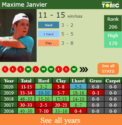 This will be the 4th time that Benjamin Bonzi and Maxime Janvier clash against each other. The head to head is 2-1 for Janvier (see full H2H stats),but they are 1-1 on hard.