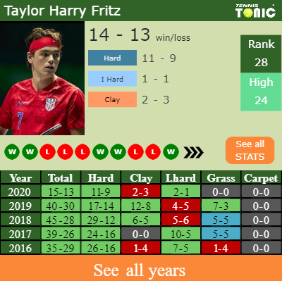 Fritz has a solid record in the last 7 years having won 61% of his matches (243-153). 2-1 on indoor hard courts in 2020. Regarding his performance on the same surface of this tournament, Fritz has a 32-24 win-loss record in the last 7 years on indoor hard courts.