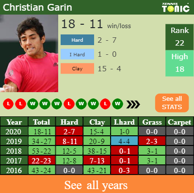 Garin has a 18-11 win-loss record in 2020, 1-0 on indoor hard courts (See FULL STATS).