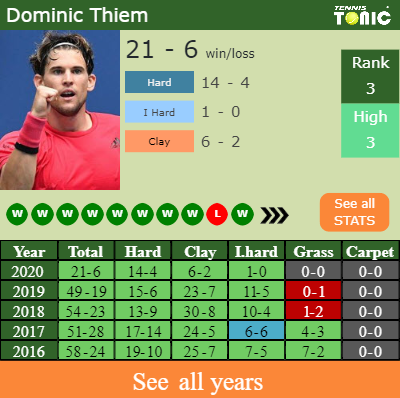 Dominic has a 21-6 win-loss record in 2020, 1-0 on indoor hard courts (See FULL STATS).