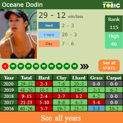 Oceane has a 29-12 win-loss record in 2020, 20-3 on indoor hard courts (See FULL STATS).