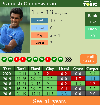 Gunneswaran has a 15-14 win-loss record in 2020, 10-7 on hard (See FULL STATS).