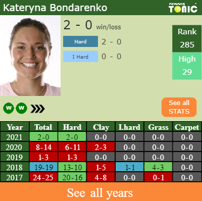Kateryna has a 2-0 win-loss record in 2021, 2-0 on hard (See FULL STATS).