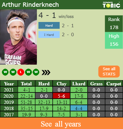 Arthur has a 4-1 win-loss record in 2021, 2-0 on indoor hard courts (See FULL STATS).
